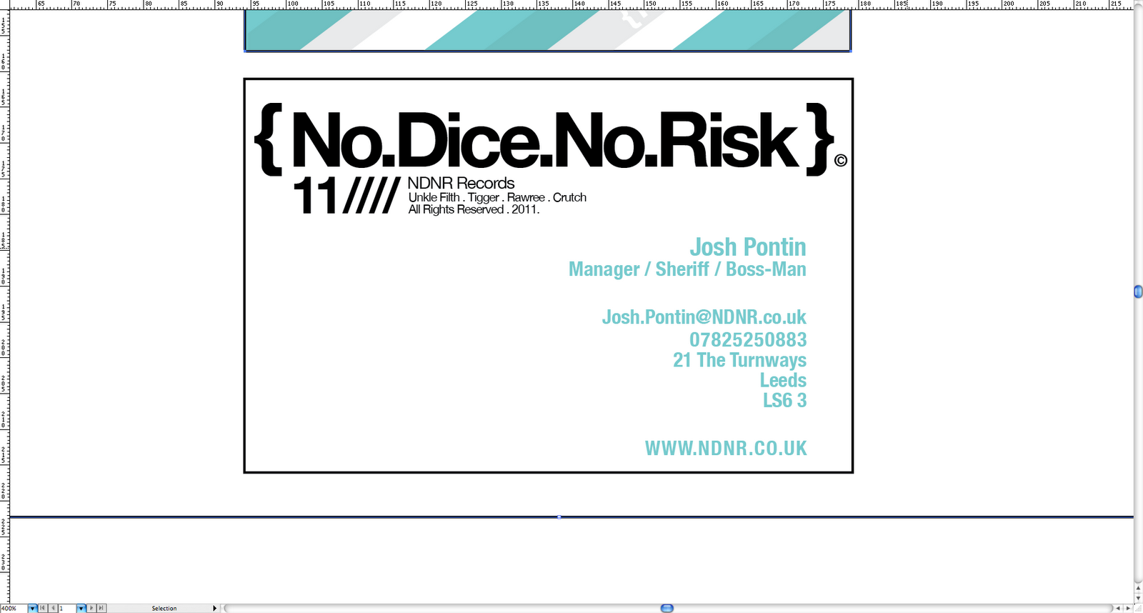 Got to the below as a final draft stage, having the logo in full, typeface same as the posters (maintaining a certain style) in the colour of the design on the front of the card. Spread out yet giving more than enough white space.I shall also be designing business cards for each of the DJ's as part of the NDNR Label. So this will be subject to change, depending on how this design fits in with using the DJ information but more importantly the DJ logos.